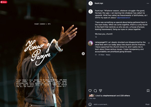 New York Religious Corporations Law, Article 10, § 195The pulpit illegally voided votes based on electronic giving records of each person. Anyone who had donated only via cash (i.e. no electronic record) had their votes voided. The pulpit did not share by what exact criteria they are deciding to void votes. It is unclear whether non-Fount pastors were able to vote.David Chan asked to be in the counting room with Ps. Josh, and Ps. Josh said no. A woman asked to be an independent witness in the room, and Ps. Josh said no. David’s lawyer then stood up and asked the same thing, and Ps. Josh said no. David’s lawyer then informed Ps. Josh that it is illegal for him to be in the room while refusing others but to no avail.The counting room only consisted of 3-4 people total, including Ps. Josh himself. The manager of the venue stood outside the room as a guard.The ballot counting concluded at ~3:30pm, and the results were released via email at 9:17pm. The pulpit announced via outside Pastors Dan Lian and Michael Strickland all 6 of the pulpit’s nominees won. Says future communication will only come from them going forward.18. On January 13, 2026, Frank Wheatley, the president of the new illegitimately elected board sent out an email self-legitimizing the winning of its own election, by simply declaring the results as “clear and conclusive”. Additionally, Frank declared Fount a global church (even though it’s only in NYC) and that both Ps. Josh and Georgie Kelsey can lead Fount NYC from Australia. Fount will presumably cover international flights twice/month for Ps. Josh and lodging in NYC for 2 weeks at a time, on top of his $200K salary. It is unclear when and how much Georgie will continue to be paid.19. On January 15, 2026, The Roys Report published a story on this matter. Multiple publications soon followed.20. On February 27, 2026, Fount sent out a letter as an update. No new concrete evidence nor review has been presented.21. Legacy Church led by Ps. Ryan Schlachter starts a few blocks down from Fount without the support of Fount. Ps. Ryan was at Fount for over 10 years serving as senior lead pastor alongside Ps. Josh. 4-5 other former Fount pastors pictured here on their first Sunday service. This follows a repeated history of former pastors/leaders of Fount showing disapproval of Josh Kelsey's Fount through their actions.22. On March 30, 2026, Fount sent out an email update. Fount says they hired global law firm Dentons to perform an investigation and forensic audit. The update declares there is no financial misappropriation but does not share the Dentons audit nor provide any statement nor lead counsel from Dentons. While declaring no misappropriation, Fount blames all financial impropriety on: (1) total absence of an expense policy, (2) the Kelseys’ ignorance of IRS tax obligations on personal compensation, (3) incompetency of the Fount accounting team in properly filing receipts, and whatever this means: (4) “the administrative infrastructure to capture and retain documentation was insufficient”. This seems to imply the ability to take a photo and send a receipt was not available to the Kelseys.Dentons produced a 455 page audit covering 11,000+ Fount transactions. Fount officially denies affected members a copy of the audit. Fount’s position is that only current active members (very few members even remain at Fount who were affected during the 2017-2025 period in question) can physically inspect a physical document under the supervision of a board member. This is secrecy, not transparency.23. The Vested Right of Former Members to Financial Inspection:The Board’s claim that "former members" have no standing and their restriction against making copies (the "eyes-only" rule) are both direct violations of New York statutory and common law.A. The right to a copy of the audit is mandatory. Under New York law, a "right to inspect" is legally deficient if it does not include the right to photocopy or scan. The Board’s "supervision" cannot be used to prevent the creation of a permanent record.“Any person who shall have been a member... shall have the right to examine in person or by agent or attorney... its minutes... and to make extracts therefrom.”